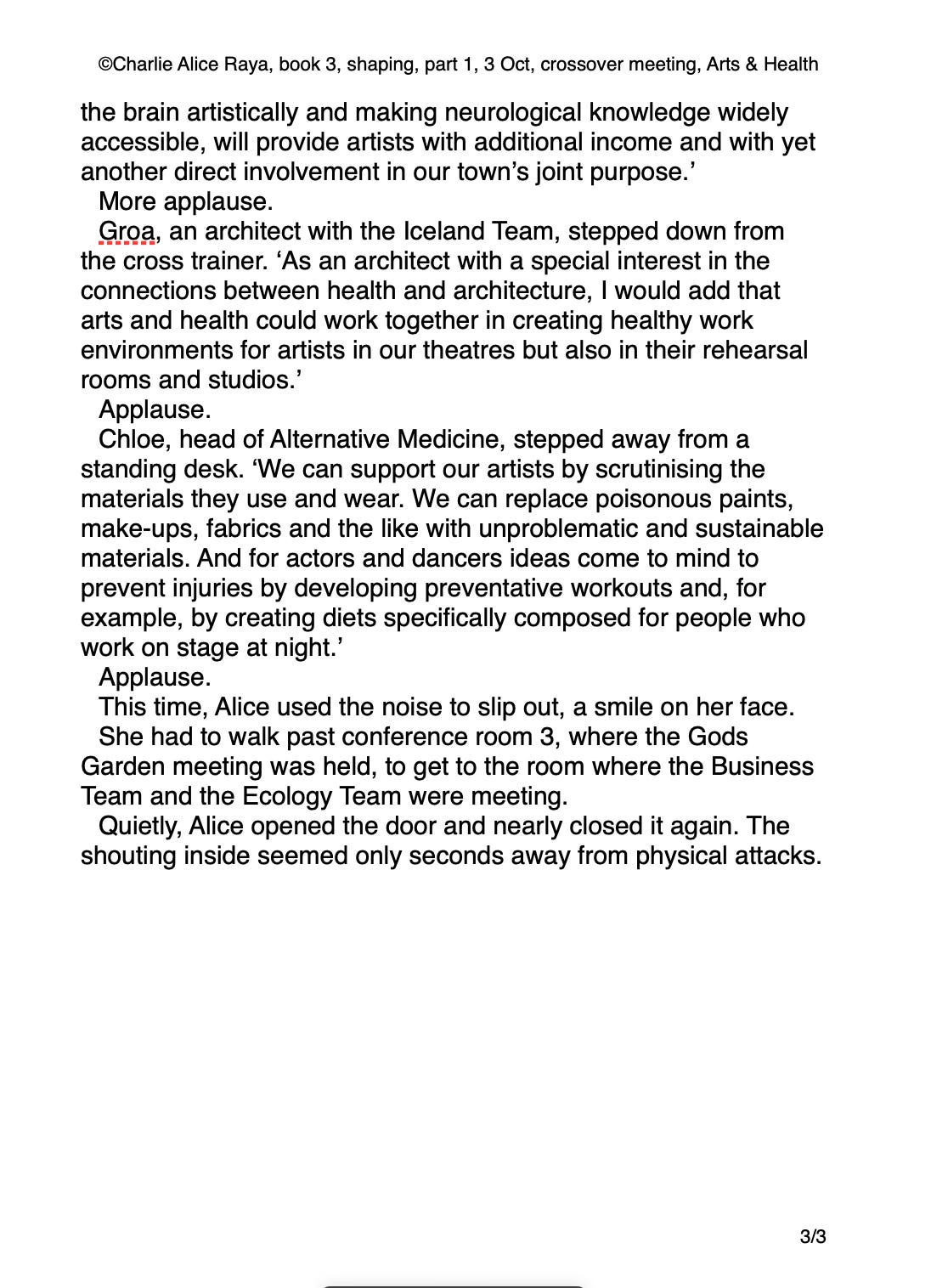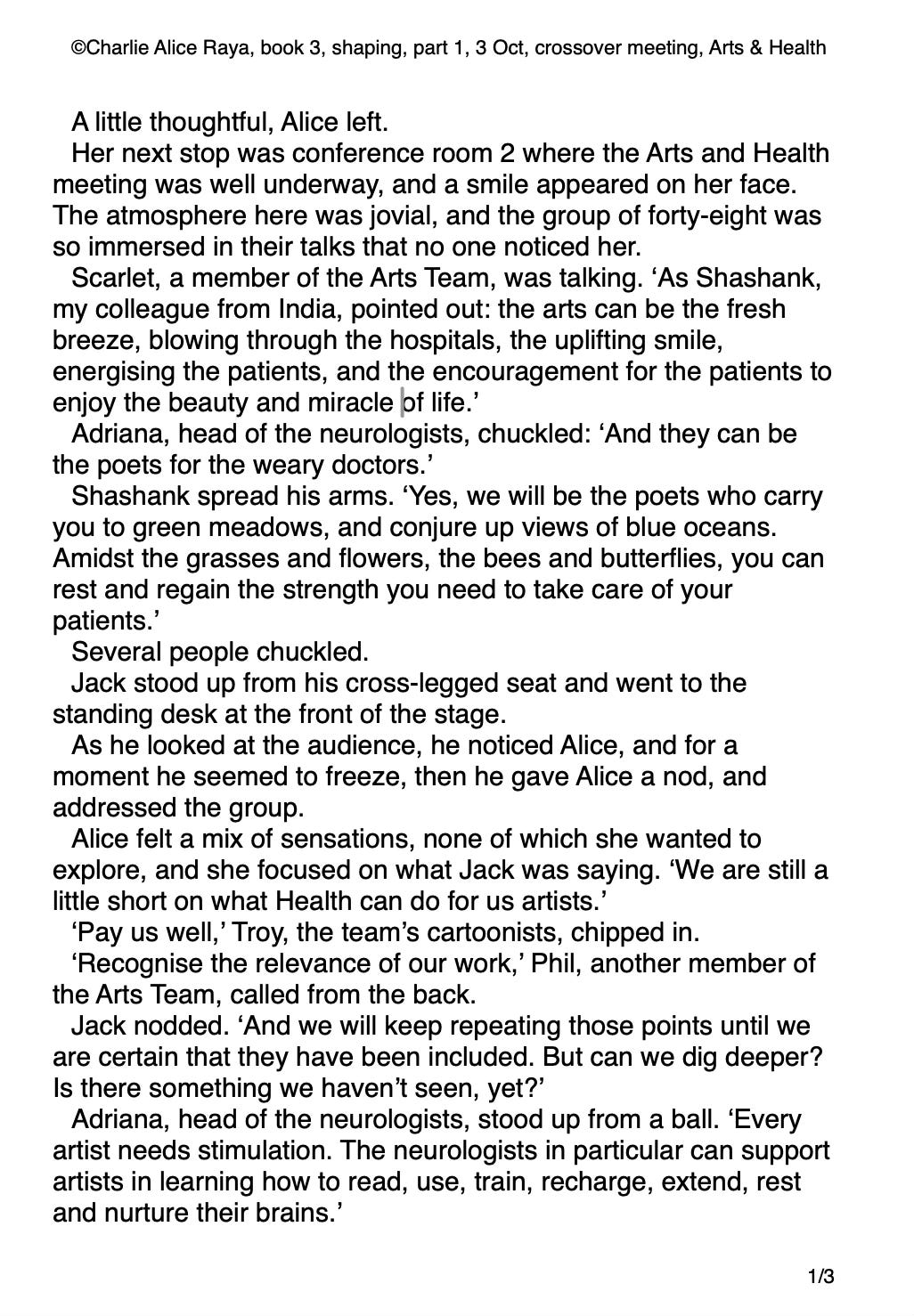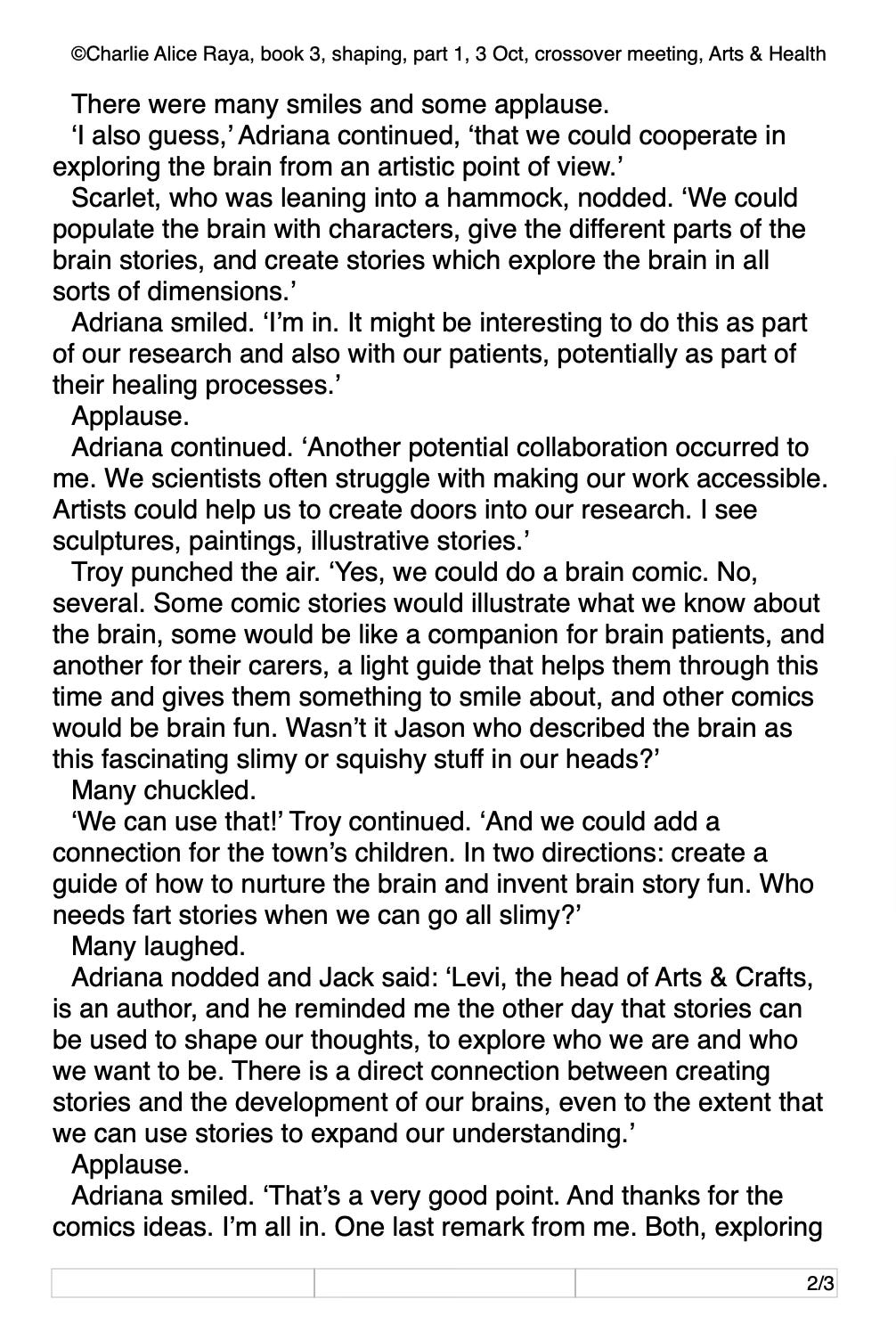 I know the characters quite well by now, so often I just let those characters happen to each other. There’s a fun chapter in book 3, shaping, where unlikely teams meet in crossover meetings to see what they can learn from each other, such as the Arts Team and the Health Team (see extract).