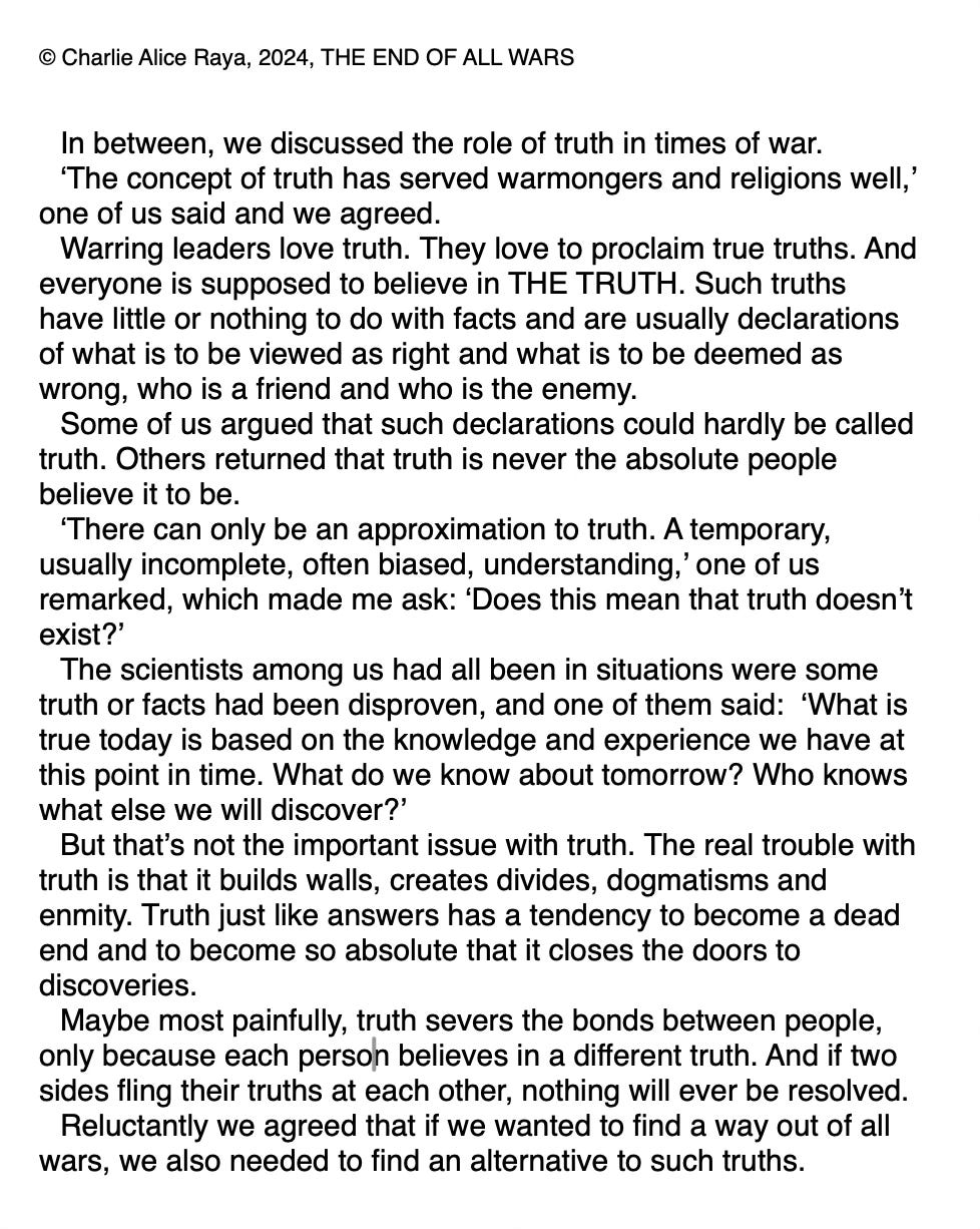 The first extract is from THE END OF ALL WARS where a group of thinkers talks about the troubles with truth in times of war.