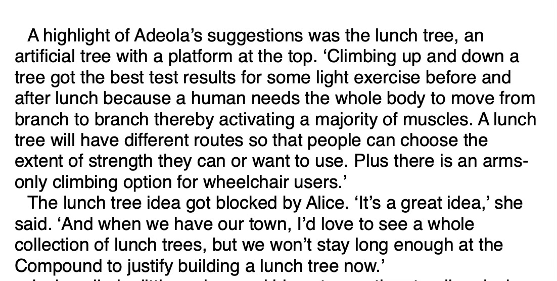 In book 2, travelling, one of the characters asks whether the team shouldn’t rethink the way they work, in particular with regard to sitting stiffly in offices, at conference tables, at lunch tables.