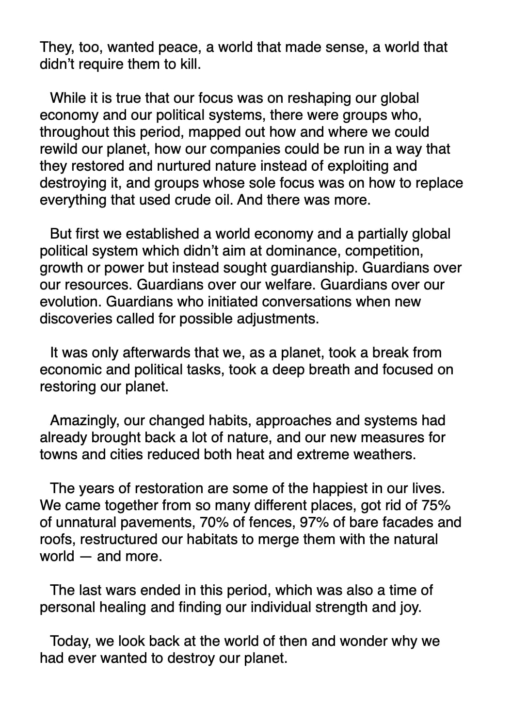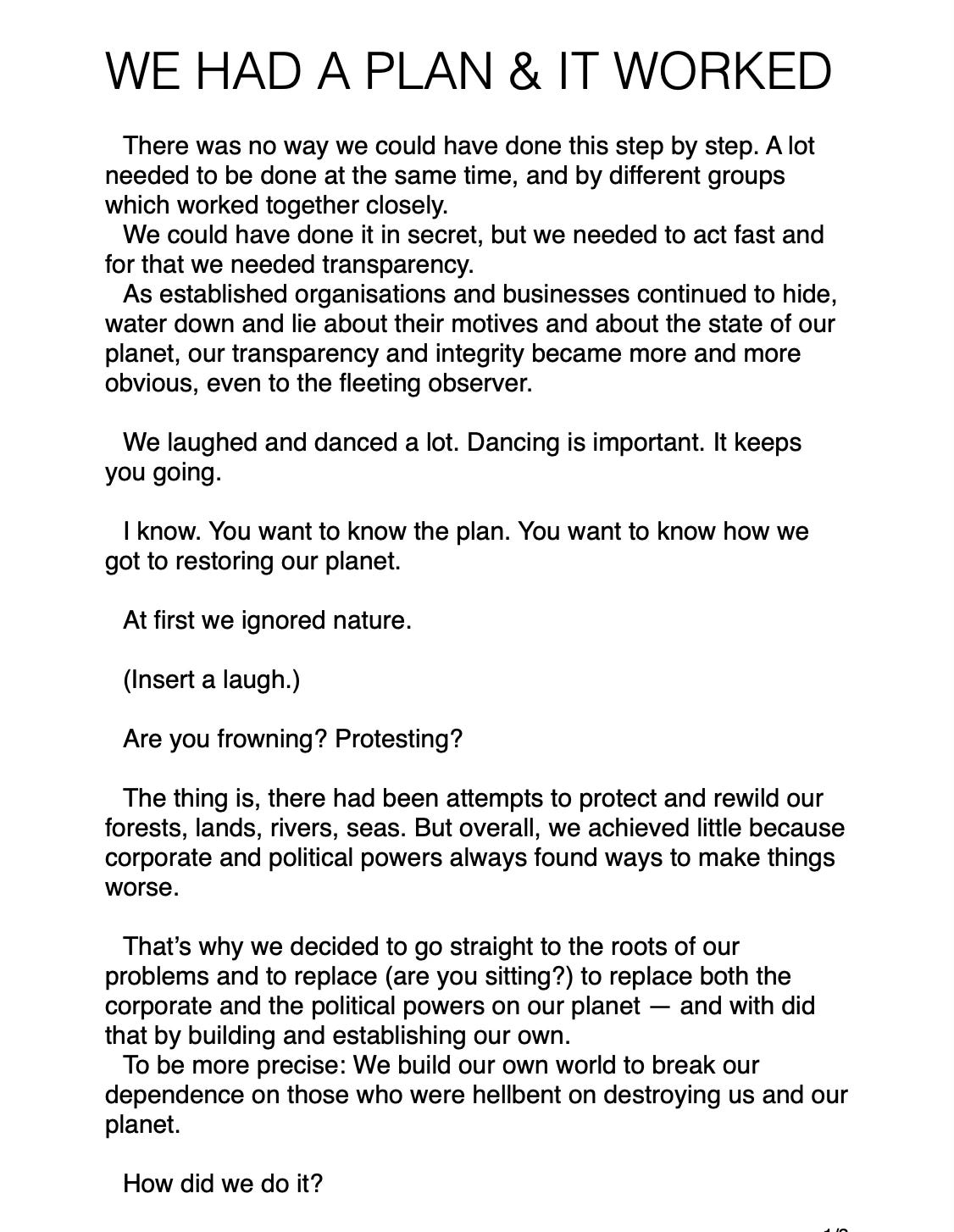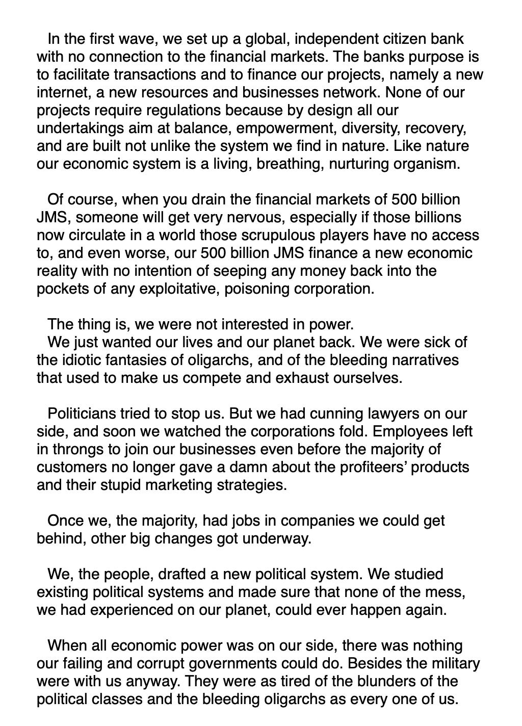 Let’s set up a project bank, let’s programme our own internet, let’s set up the first two or three new businesses and the related supply networks, and from there let’s add one business after the other, covering everything from foods to tech, from clothes to books, and with that create a world that has finally shaken off the damaging narratives of competition, profiteering and exploitation of people and planet.